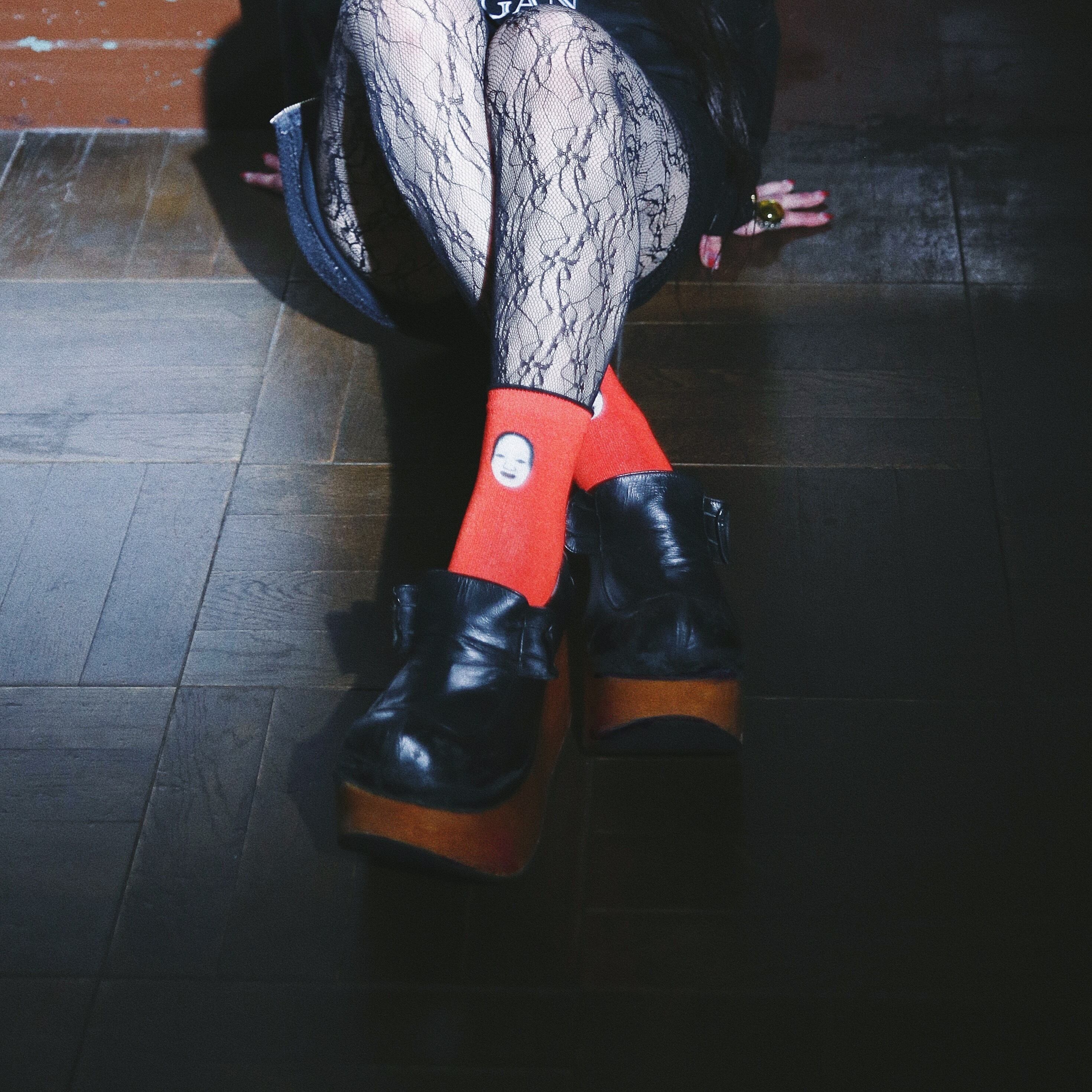 強い怨念により、霊的な力を持った人間ではないものに変貌する様子を現した泥眼(でいがん)のソックス。怨念を感じさせる赤が映えるアイテムです。